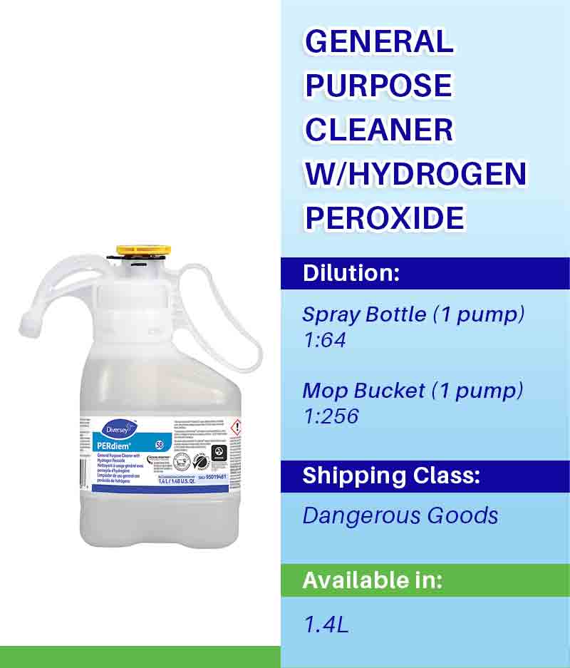 GuidelinesDiversey Perdiem Smartdose 1.4L with Hydrogen Peroxide is a concentrated general-purpose cleaner based on proprietary Accelerated Hydrogen Peroxide (AHP®) technology for high-productivity cleaning. Use for a variety of cleaning applications including floors, glass, and other hard surfaces. Heavy Duty Spray & Wipe Cleaning, Restroom Cleaning, or Carpet Spotting