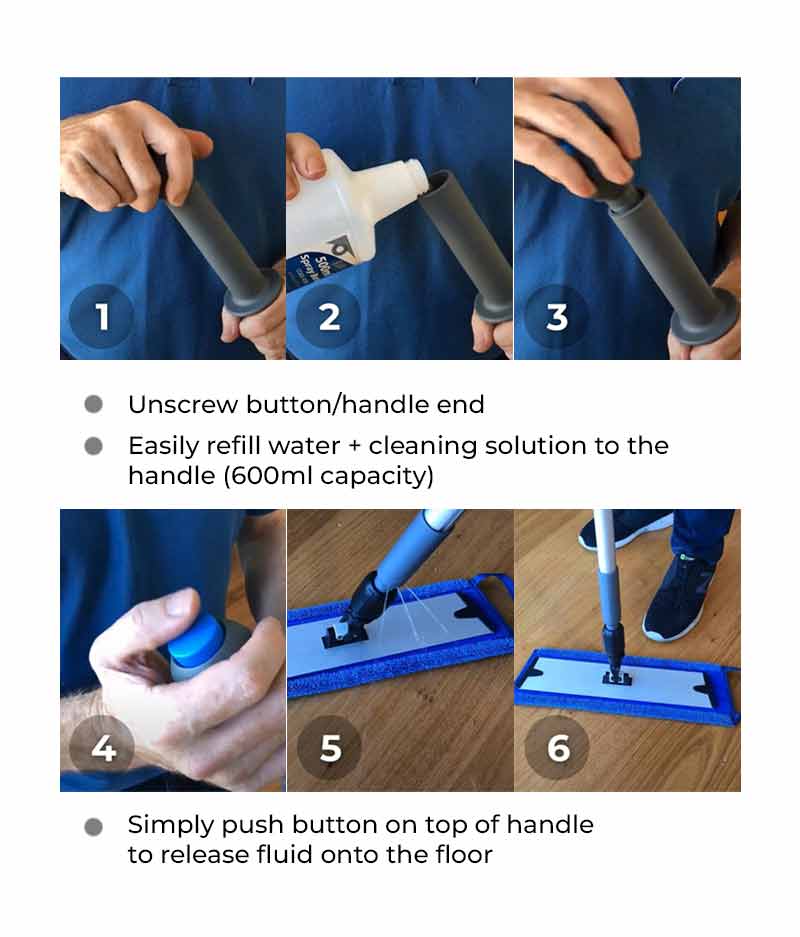 • Easily refill water + cleaning solution to the handle (600ml capacity)