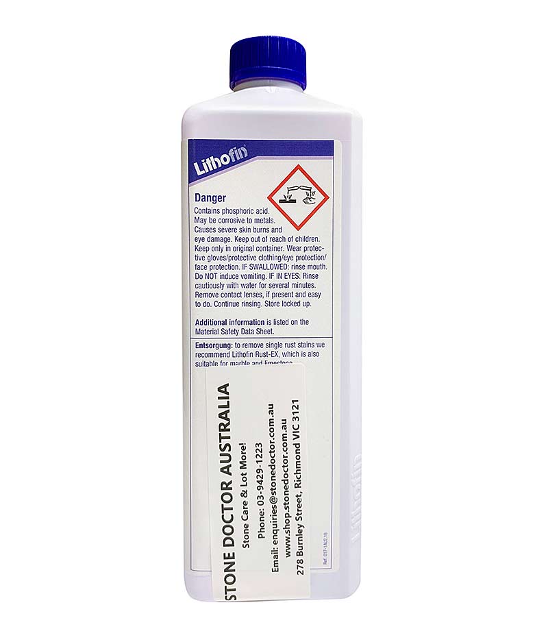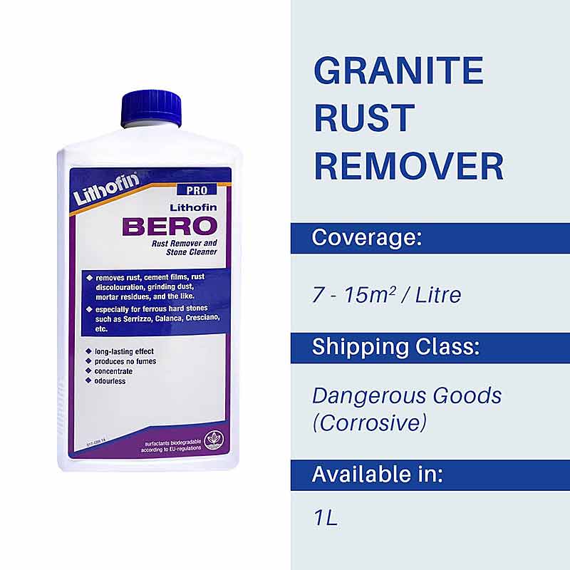 - Lithofin BERO - 1 LITRE removes rust and rust discolouration and is also suitable for removing cement residues from iron containing natural stones.