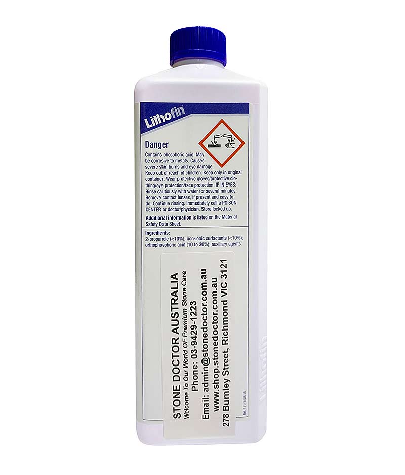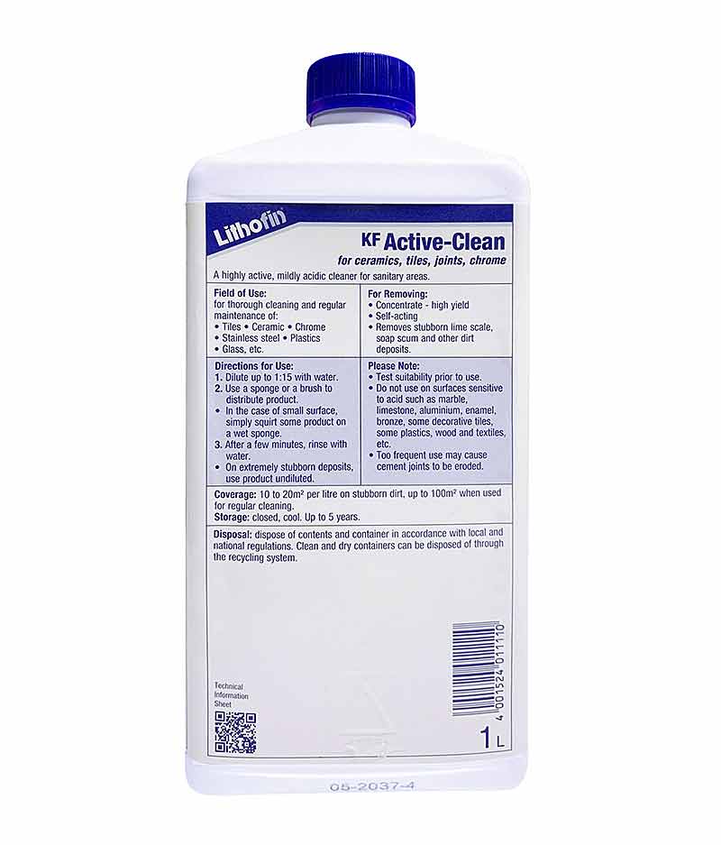 Lithofin KF Active-Clean - 1 LITRE removes surface residues such as calcium, lime, and dirt deposits, soap scum and greasy residues & rust. Also, Lithofin KF Active-Clean - 1 Litre is designed for periodic maintenance care in wet areas that of bathrooms, showers, and toilets as well as other ceramic tiled kitchen areas which elevates both shine and hygienic cleanliness. Lithofin KF Active-Clean - 1 LITRE is suitable for ceramic tiles, grouting, chrome, stainless steel, etc. Not suitable for acid-sensitive surfaces.