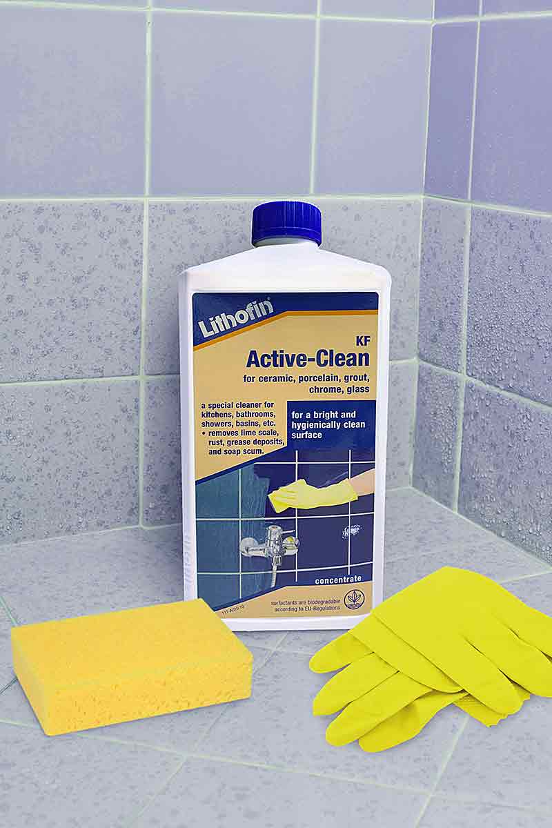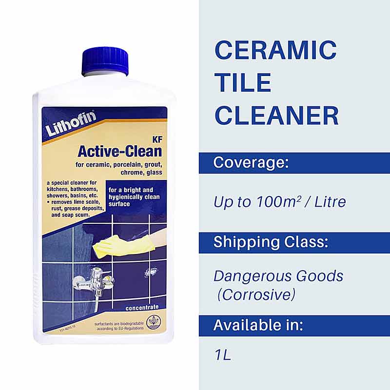 • Lithofin KF Active-Clean - 1 LITRE is suitable for ceramic tiles, grouting, chrome, stainless steel, glass and many types of plastics. Not suitable for polished marble, limestone and other acidic sensitive surfaces.