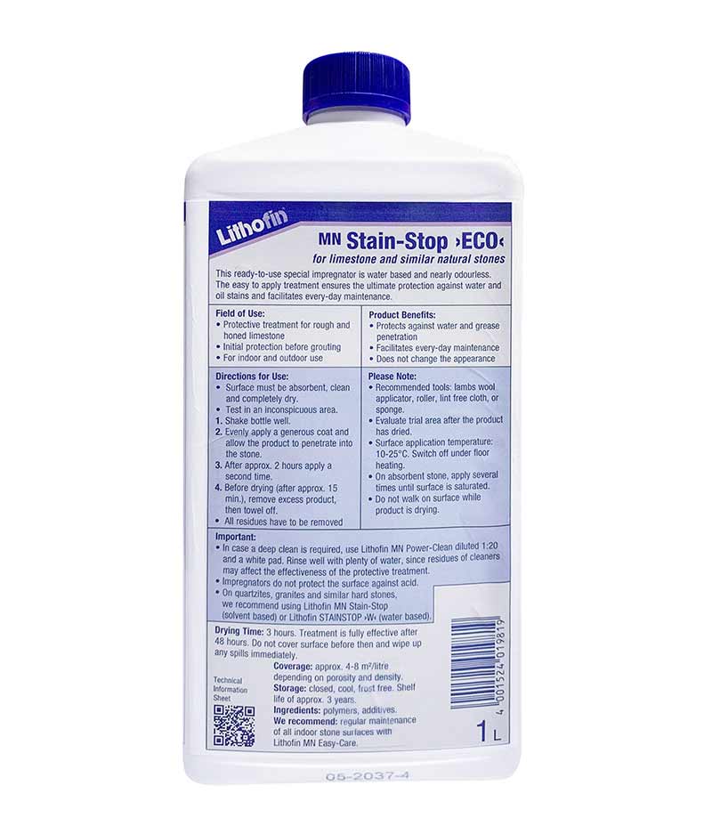 The good thing is that Lithofin MN Stain-Stop ECO doesn't change the look of the stone, and it's perfect for porous, highly absorbent limestone surfaces. Lastly, Lithofin MN Stain-Stop ECO usually looks more natural after it has been applied and set. Lithofin MN Stain-Stop ECO usually protects for over ten years.