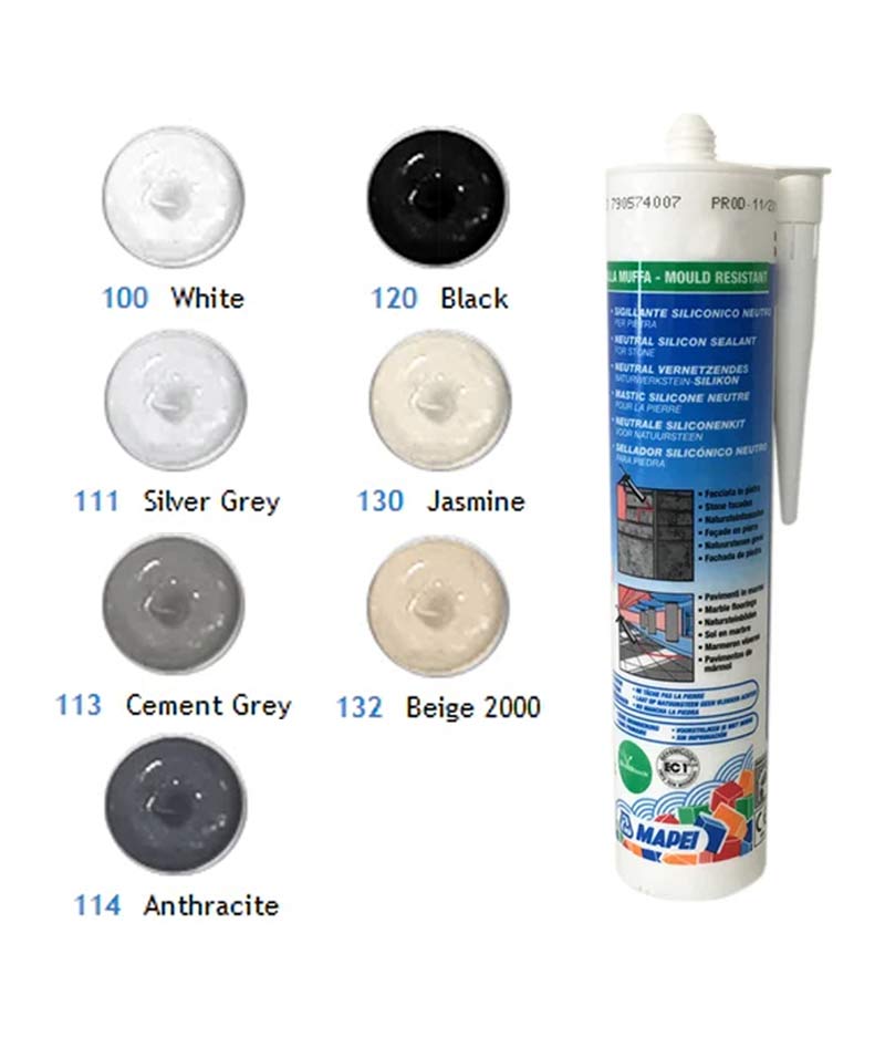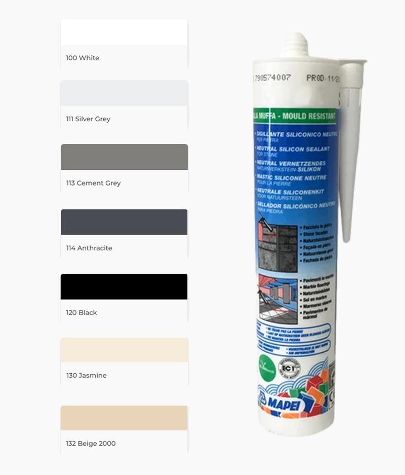 Mapesil LM Neutral Cure Silicone - 310ml is available in 6 colours. White, Beige, Jasmine, Cement Gray, Silver Grey, Anthracite, Black.