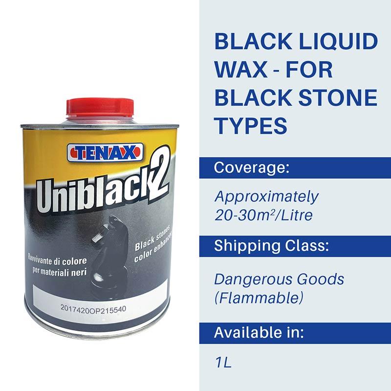 Tenax Uniblack2 - 1 Litre is a black liquid wax used to increase the black effect on polished, brushed and smooth surfaces. Tenax Uniblack2 - 1 Litre increases the black effect without the increase of the gloss. It is used on black granite materials in that Black Zimbabwe, Black Africa and Black Indian granite.